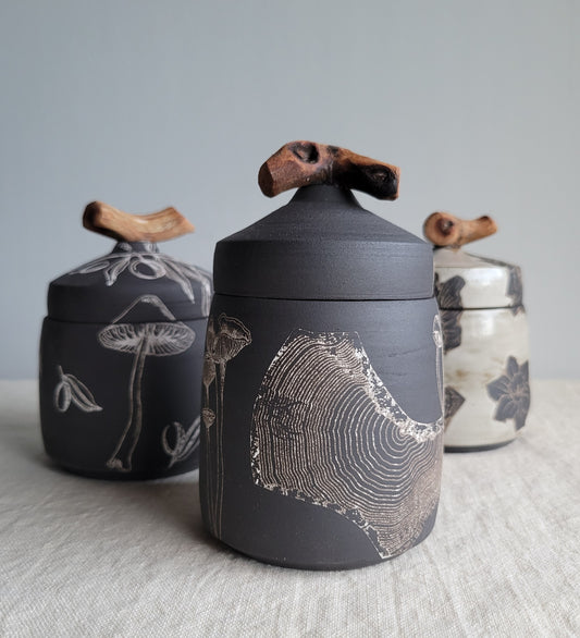 Black Clay Treasure Box Olive Branches and Mushrooms