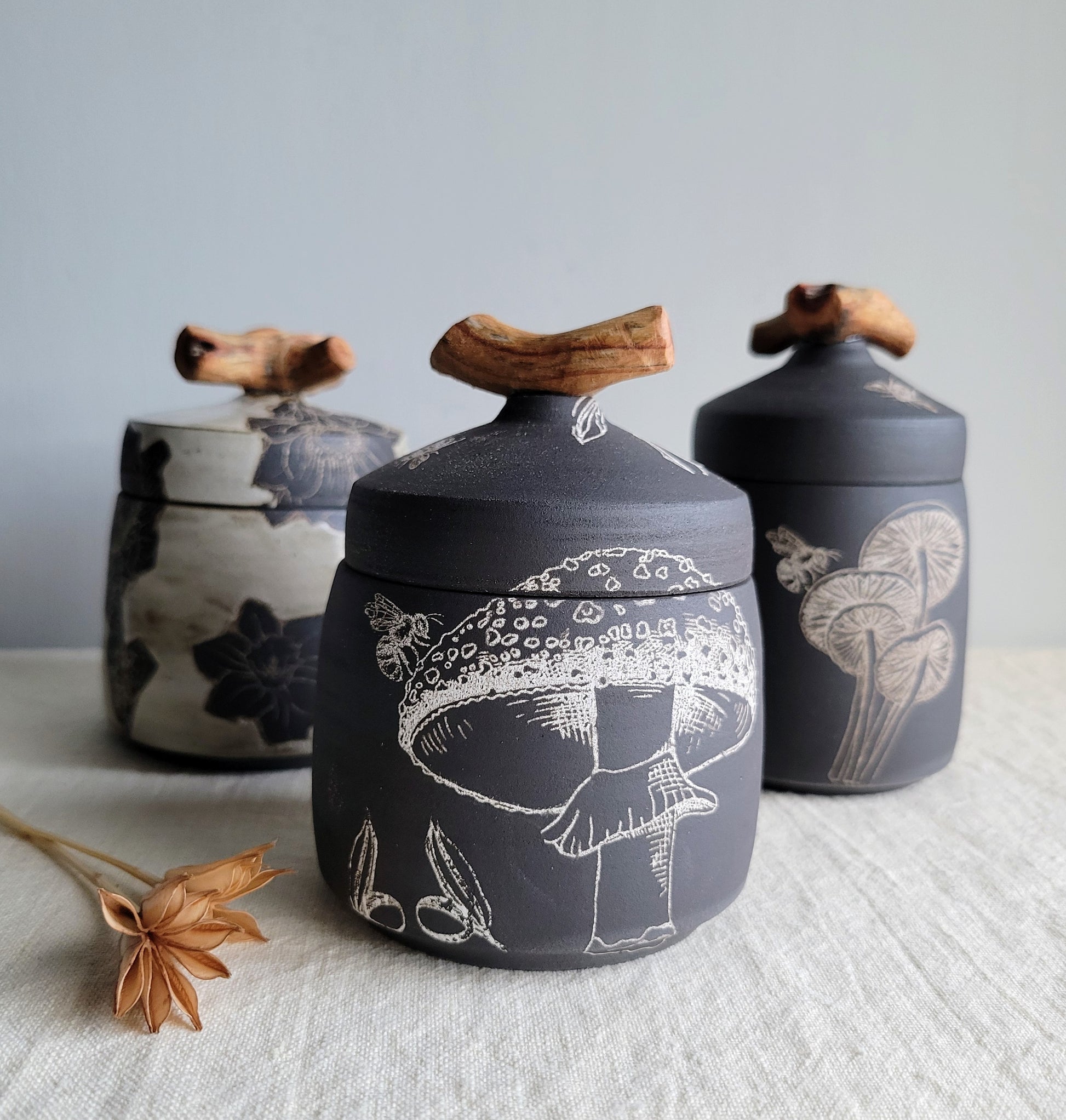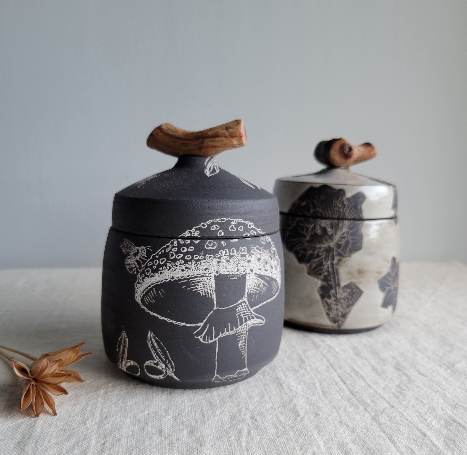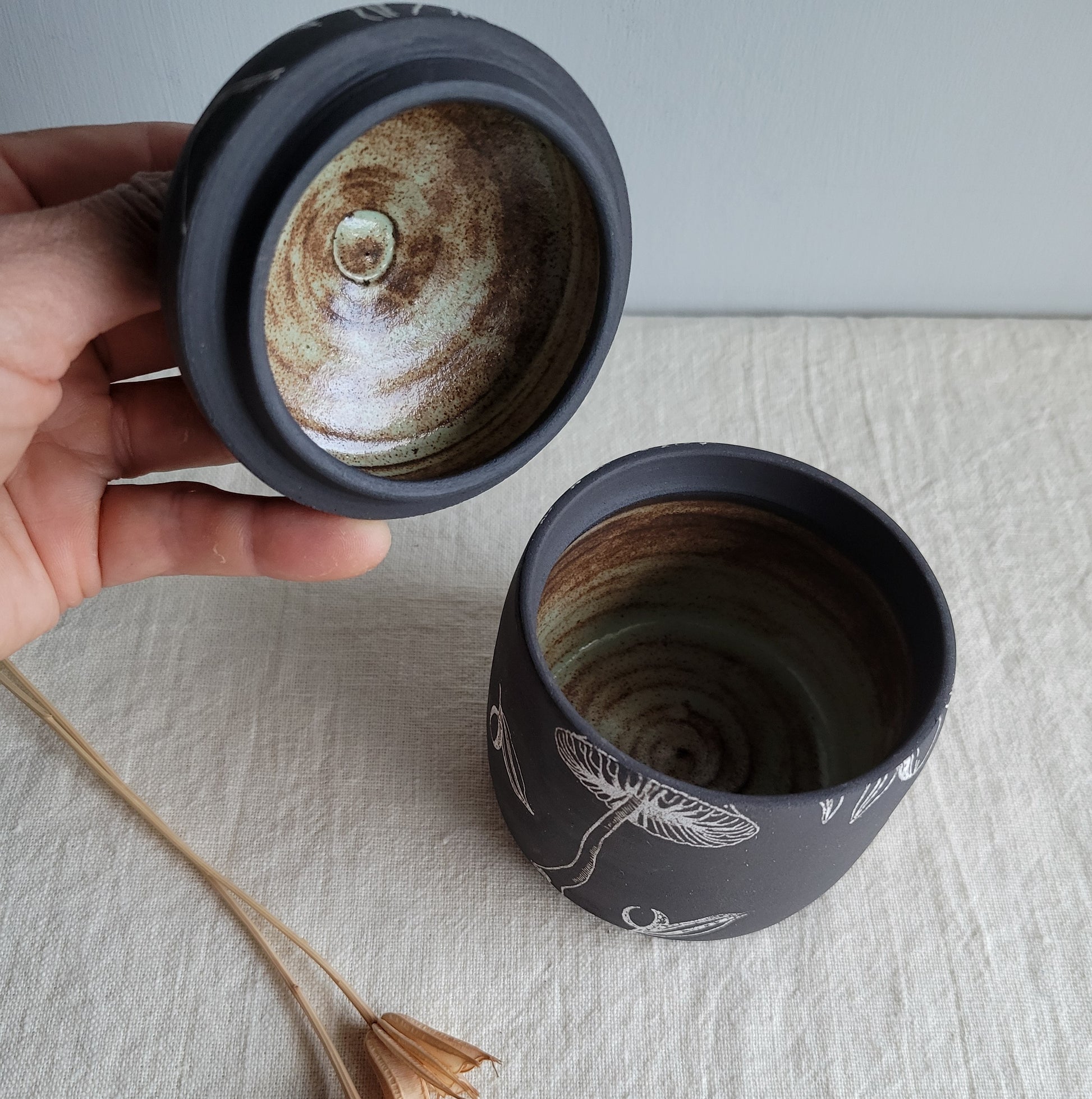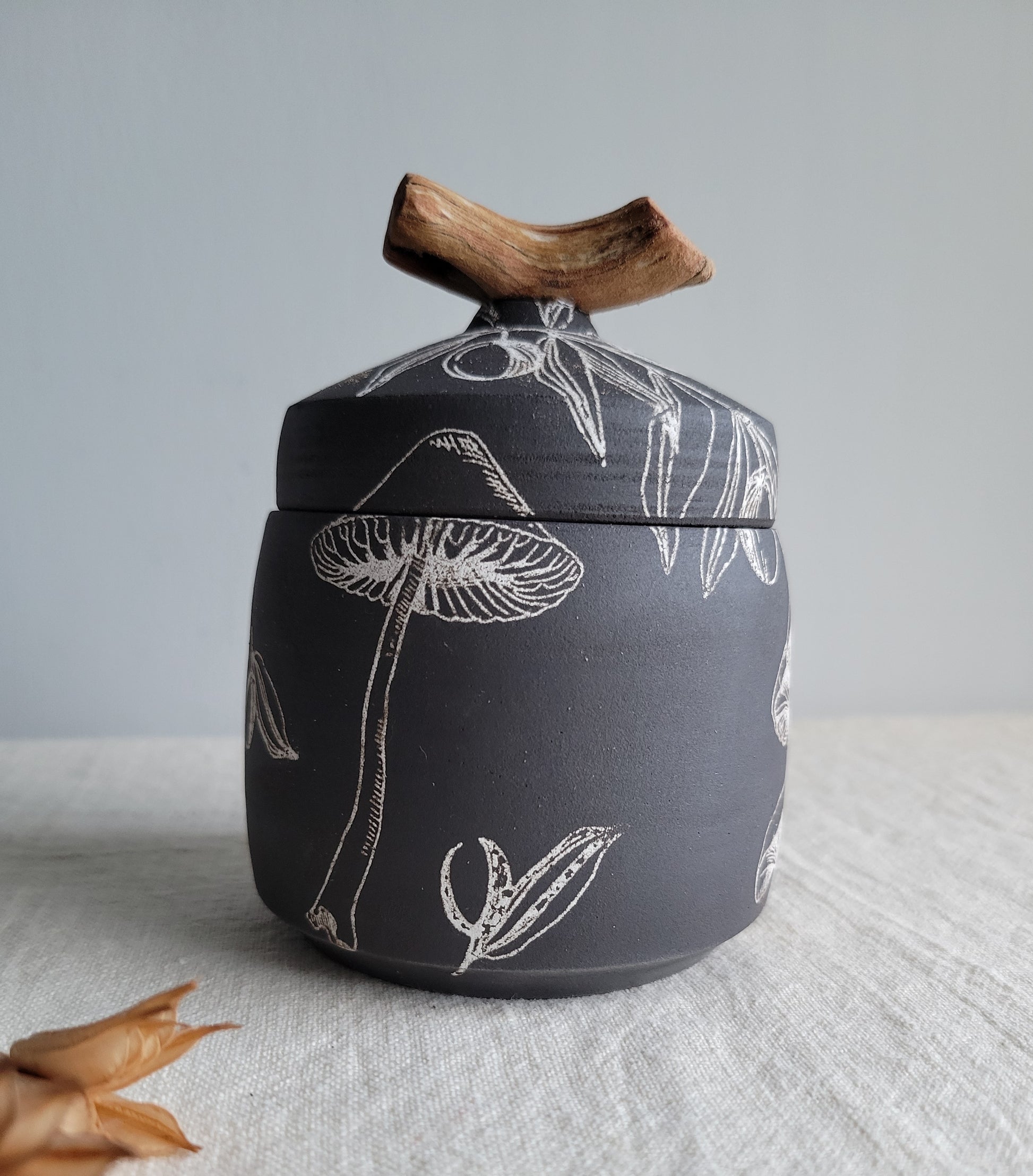 Black Clay Treasure Box Olive Branches and Mushrooms