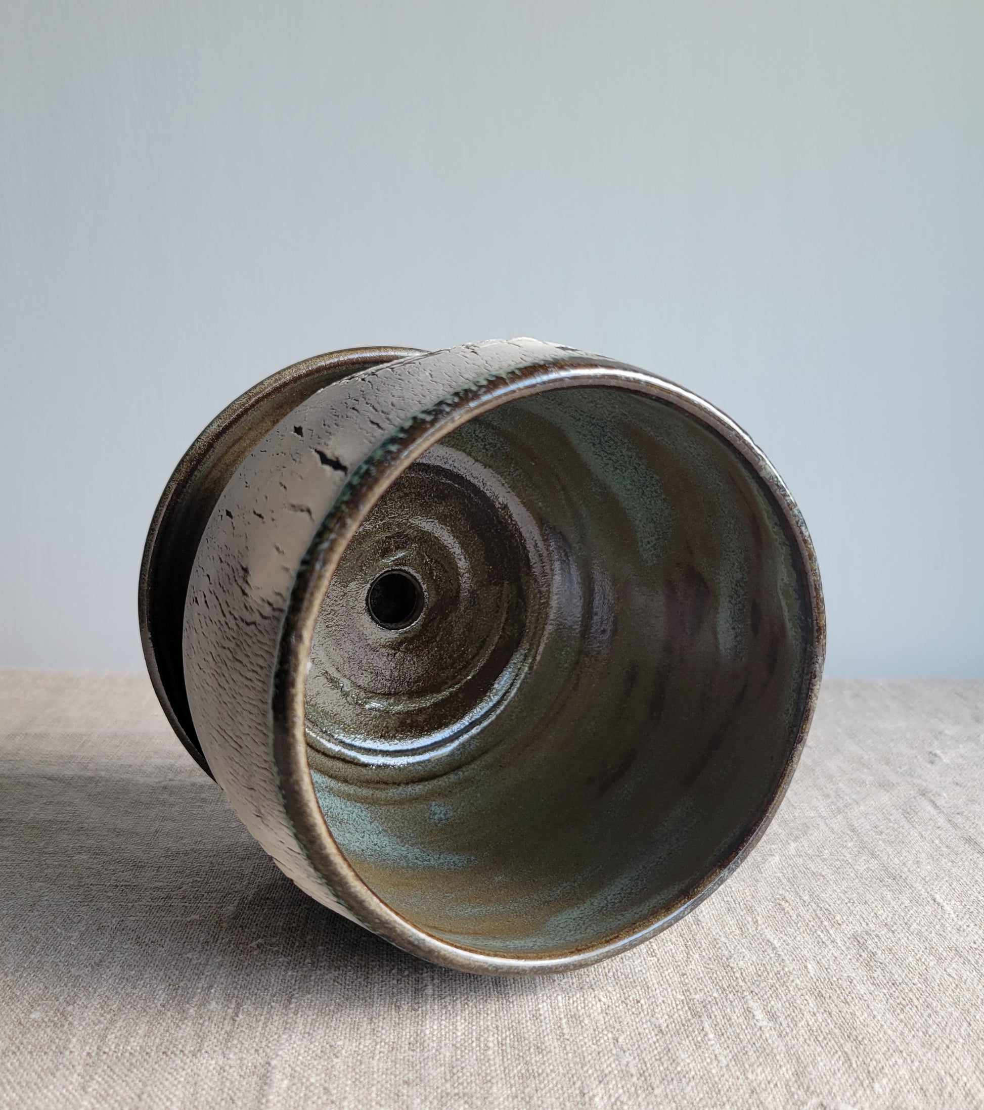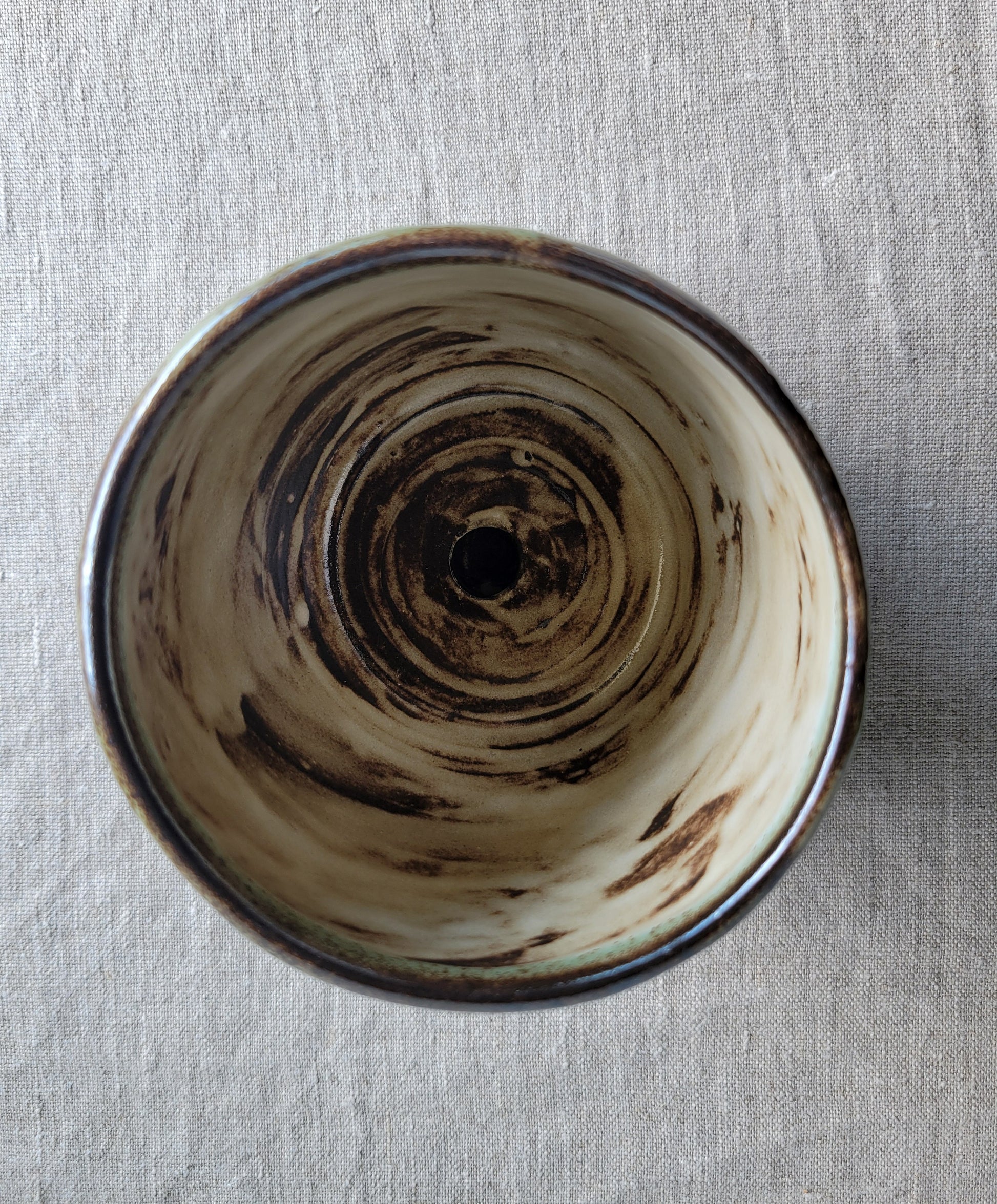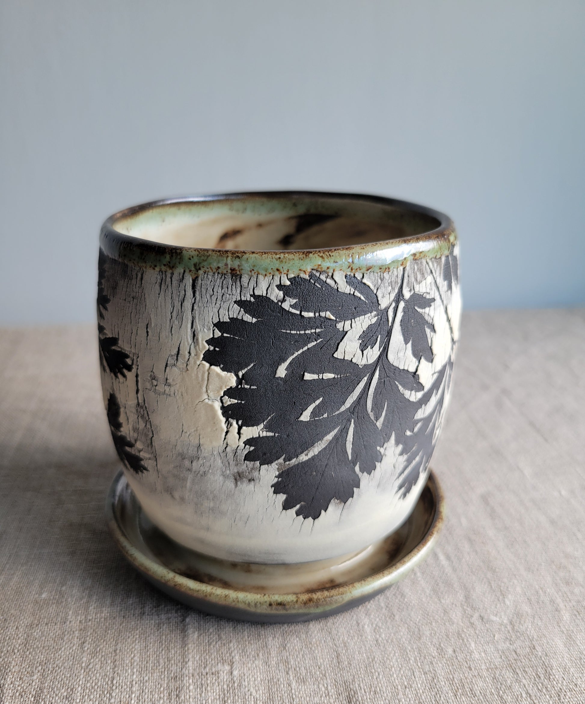 It was hand thrown using black clay. Porcelain slip was painted over the leaves and the pot was stretched from the inside. This created the cracked earth texture.