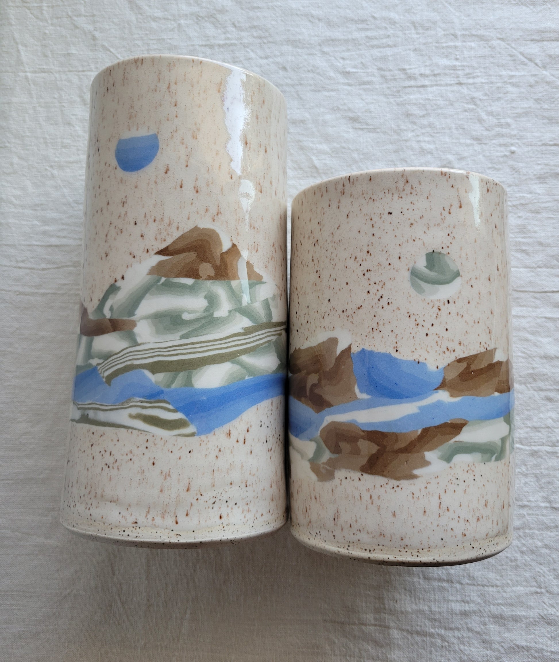 Layers of colored porcelain were arranged into a mountain landscape on speckled clay. After inlay the piece was shaped into a cylinder. The landscape design wraps around the piece.