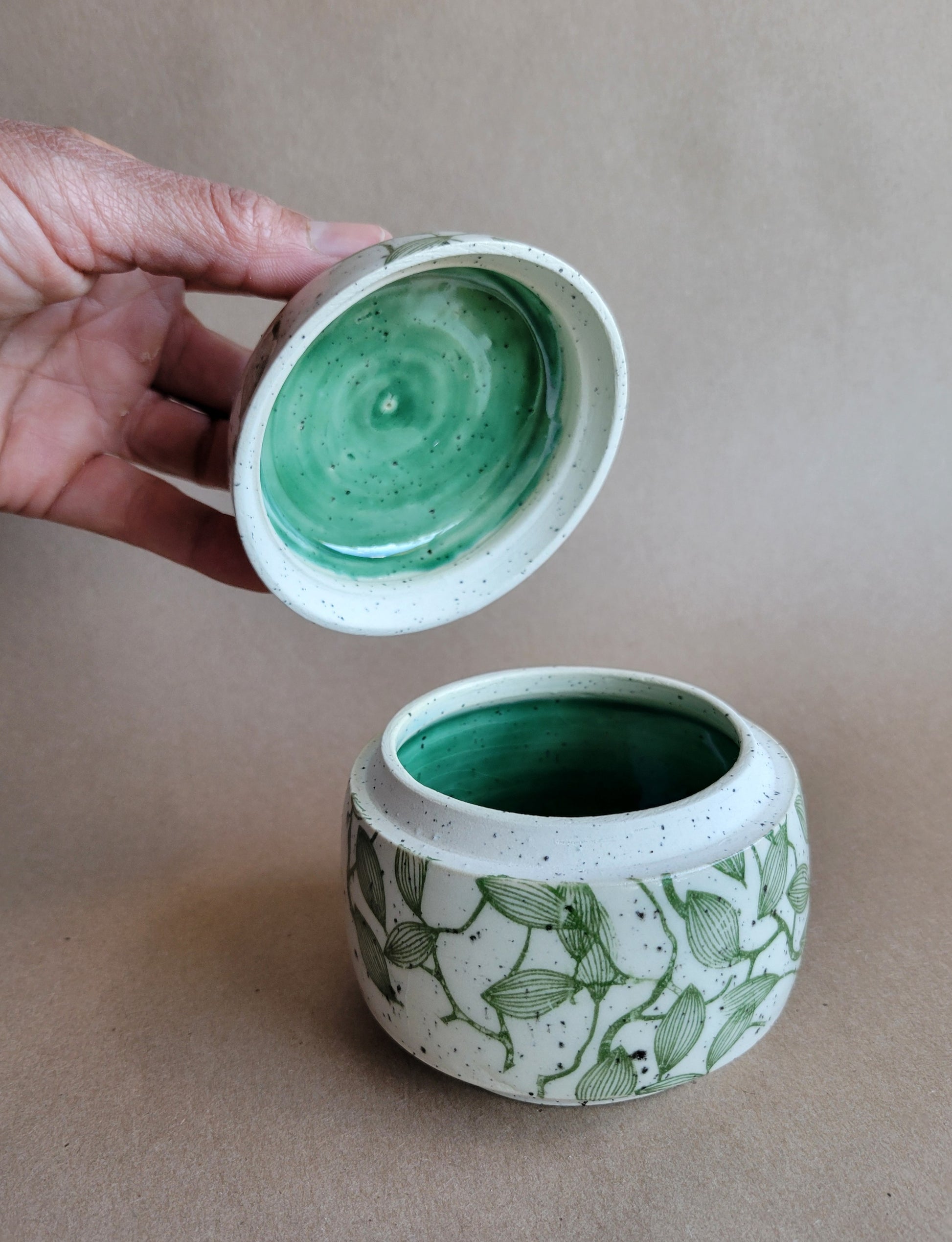A one of a kind treasure box made from speckled clay. It has green pod designs fired onto the piece. The inside has been glazed jade green.